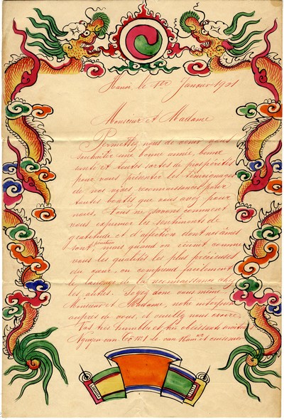 1901. Lettre de voeux illustrée à la main d'Hanoï