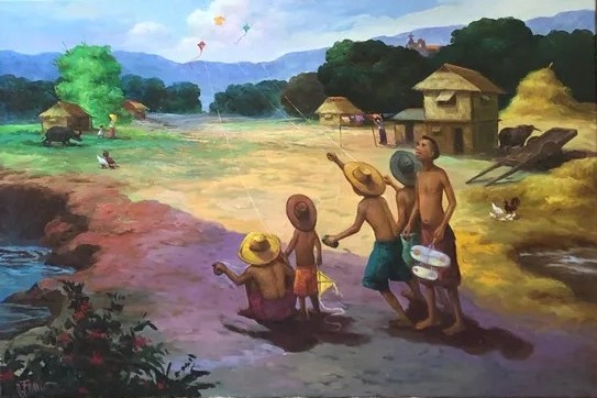 Années 90. Philippines, enfants aux cerfs-volants. Huile sur toile de Franco 90x60cm