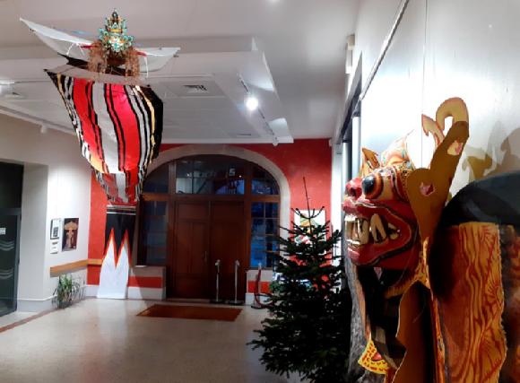 Hall des cerfs-volants de Chine vu du grand escalier : le dragon à neuf têtes (puissance et chance)